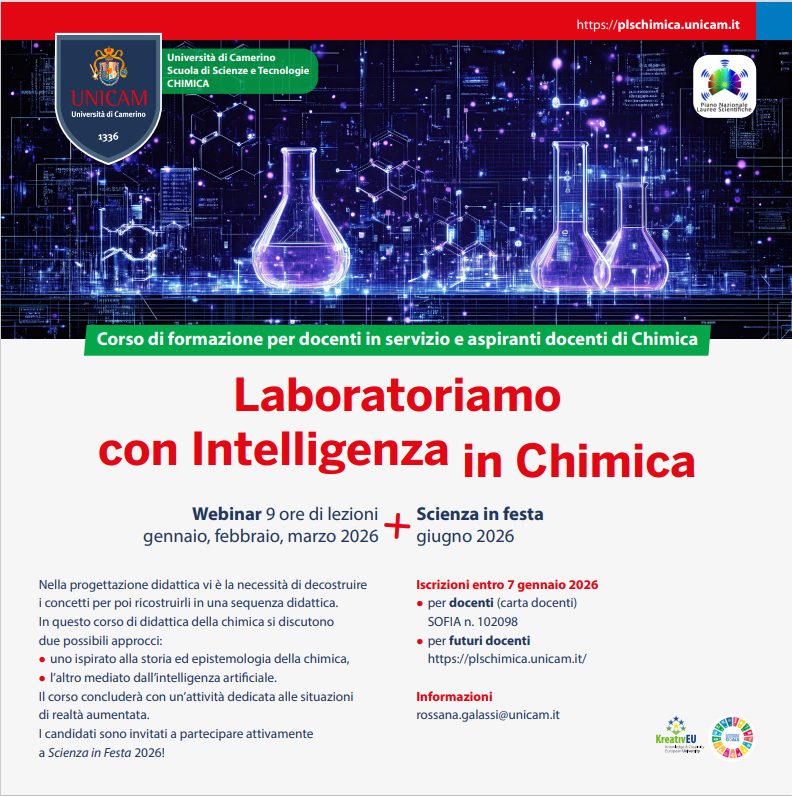 Iscrizioni su piattaforma SOFIA n° 102098 o al link https://plschimica.unicam.it/, mediante apposito modulo, di iscrizione da inviare a rossana.galassi@unicam.it entro il 7 gennaio 2026.